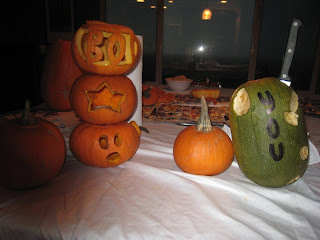 We invited everyone over for pumpkin carving (this year Halloween was on Sunday, so all the carving and trick or treating were on Saturday)...Zacky cleaned his pumpkin out all by himself. (Taylor and I drove around looking for pumpkins, but all we could find were mini ones. Taylor was happy, though, because she wanted to make stacked 'snowman pumpkins' )
